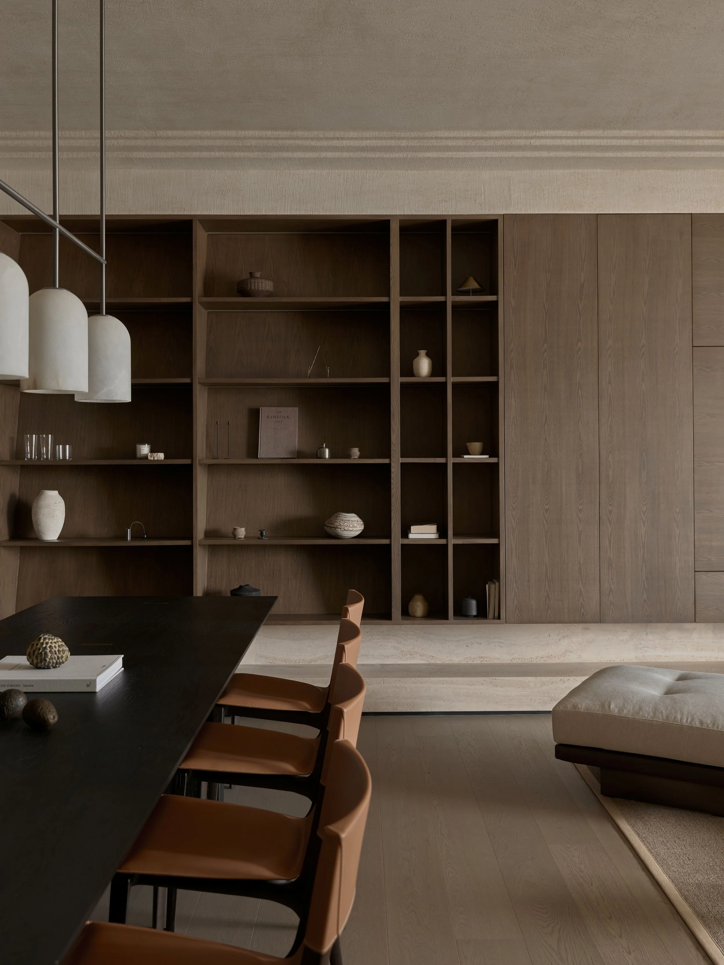 At the heart of the home lies an open-plan common area that seamlessly integrates pantry, dining, and living functions. A sculptural kitchen island, clad in striking Christmas green marble, anchors the space, while a custom bookshelf-and-storage backdrop adds rhythm and utility. The overall palette leans muted and tactile—travertine, dark-toned ash wood, and textured wall finishes—offering a grounding contrast to the occasional pop of color and material from select loose furniture pieces, including a stainless steel console.